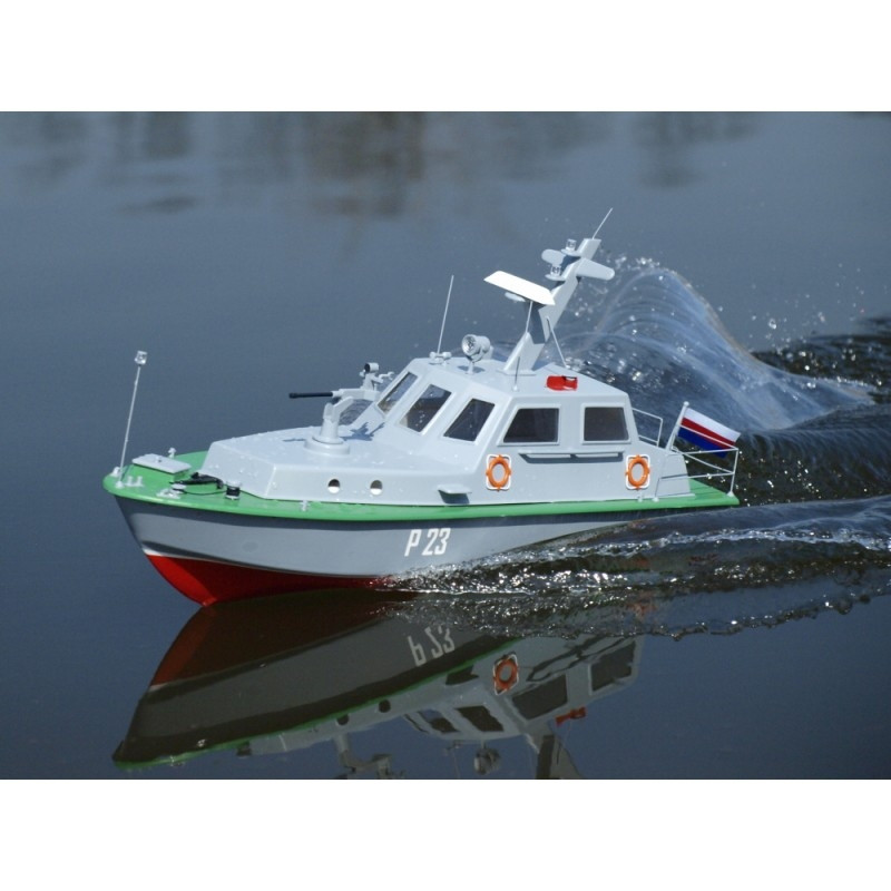 The kit includes vacuum-molded parts of the hull, deck, cabin, plinth, parts for storing individual parts of the RC kit, parts of the propulsion unit (steering fin, steering lever, three-blade ship propeller, shaft, flexible coupling) and other parts to complete the model (machine gun, life rings, rails, anchor, anchor windlass, searchlight, lights, radar, horn, ladder, mast, flagpole, crossbeams, channels and color sticker with windows and ship's name).