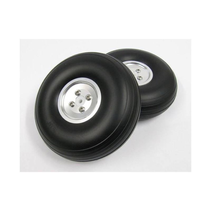 A wheel for flying models, made of "full" and elastic rubber, mounted on a light, twisted aluminum rim with a PTFE sliding sleeve.