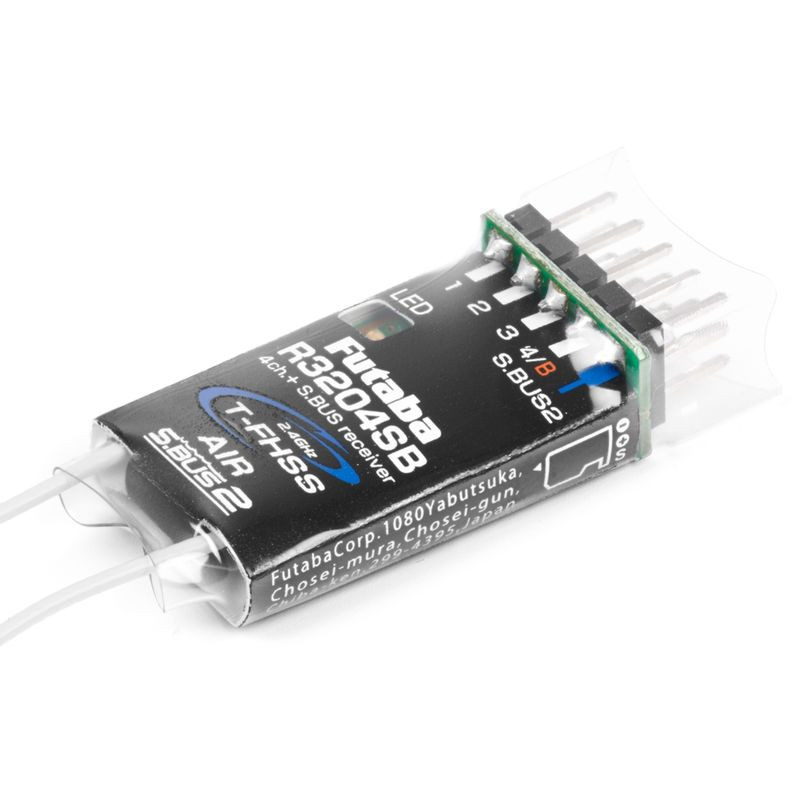 A small four-channel Futaba T-FHSS Air-2.4GHz transmission system telemetry receiver with a pair of full-band differential antennas. It is designed for use in models of all categories, thanks to its compact dimensions, light weight, connectors located in the longitudinal axis and the ability to operate with a 1S LiPo (3.7 V) power supply, it is also suitable for very small and lightweight models. The R3204SB provides 4 classic PWM channel outputs and an S.BUS2 port for bidirectional communication, allowing connection of S.BUS2 servos and telemetry sensors. It supports the "model ID" function. The receiver's operating states are indicated by an LED.