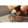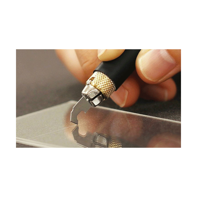 A blade for cutting hard plastics like Plexiglas, laminate, polystyrene and even for aluminum sheet. Cutting involves scratching the material to be cut with the knife several times along the ruler, and then breaking it along the notch. The use of tool steel with appropriately selected parameters and precise sharpening resulted in a blade that cuts easily, accurately and extremely durable.