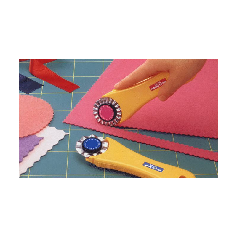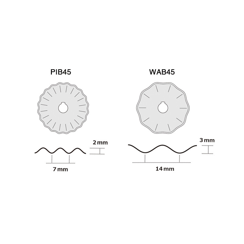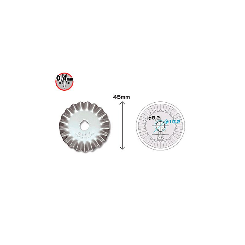Special blade with a diameter of 45mm designed for "toothed" line cutting of fabrics, foils, rubber, sponge, paper, etc. on OLFA backing mats along straight and curved lines. It is designed for WAC-2, PIK-2, RTY-2/DX knives. It is made of stainless steel with appropriately selected parameters. Precision sharpening results in a blade that cuts easily, accurately and extremely durable.