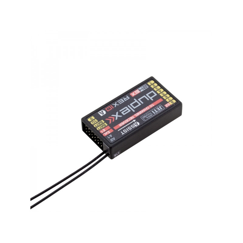 jeti REX 10A 10-channel full-range receiver with built-in ASSIST stabilization system, supporting telemetry functions and compatible with Jeti EX and EX Bus protocols.
