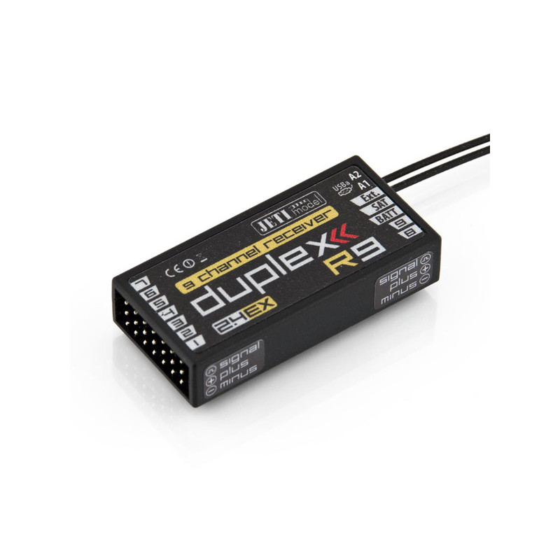 The nine-channel DUPLEX R9 modeling receiver operating in the 2.4 GHz band - compatible with DUPLEX modules, from the renowned Czech company JetiModel. With simple programming and pairing, compact dimensions, low weight and the ability to serially connect two or more receivers into one, as well as the ability to fully program mixers and channel functions (thanks to the optional Jeti BOX), the Duplex R9 is one of the most versatile receivers on the market. In addition, mounted optional telemetry sensors that transmit "live" information from the model to the transmitter via the receiver, further enhance the value of the product.