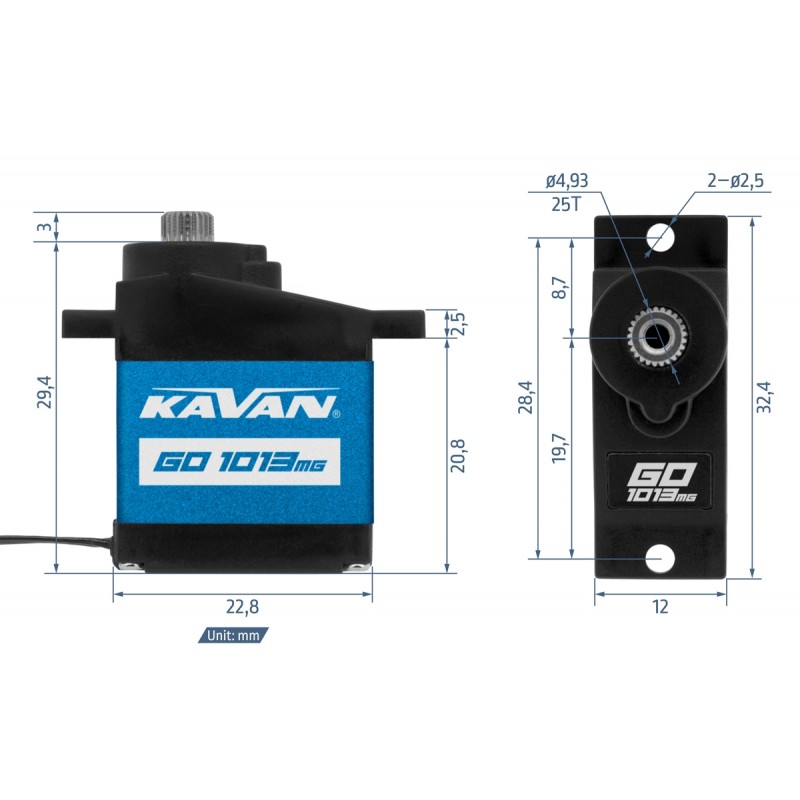 Very powerful programmable digital picoservo from Kavan with titanium gears with output shaft mounted on two ball bearings for use in small RC aircraft models, RC cars 1: 14-1: 24, helicopters size 400-450 etc. For perfect cooling even under heavy loads the servo is in a plastic housing with an aluminum heat sink in the center.
