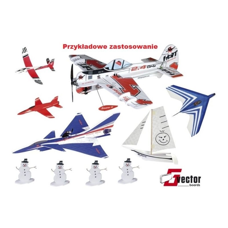 Graupner /SJ Vector foams with a thickness of 0.2-2 mm are ideal for miniature indoor models weighing less than 30g. They can be used to make wings, fuselages and fins. The material is very well suited for thermoforming simple shapes. Thicker boards (2-3 mm) are ideal for building remotely controlled hall models. The manufacturer made the material as light as possible, thanks to which Vector foam is second to none!