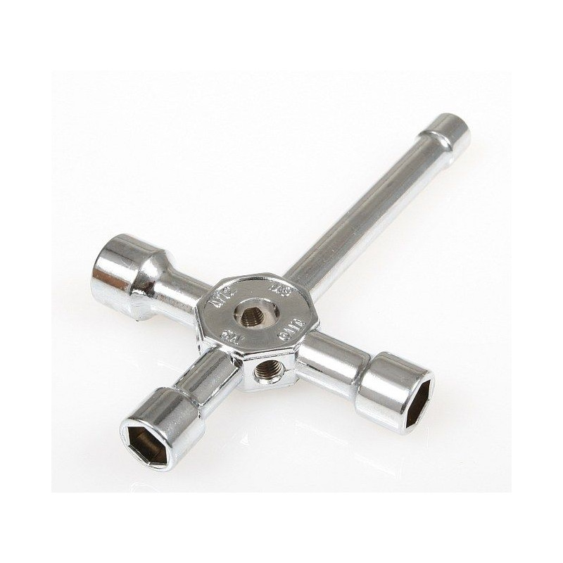 Universal socket wrench for glow plugs (long). With additional sockets we can unscrew / screw: propeller, wheel in the car, etc. The body has 2 threaded holes for storing glow plugs.