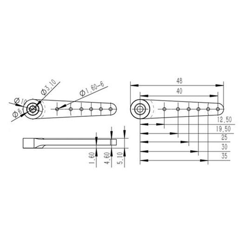 distance from servo mounting hole to snap holes: 12.5 / 19.5 / 25 / 30 / 35 / 40 mm
