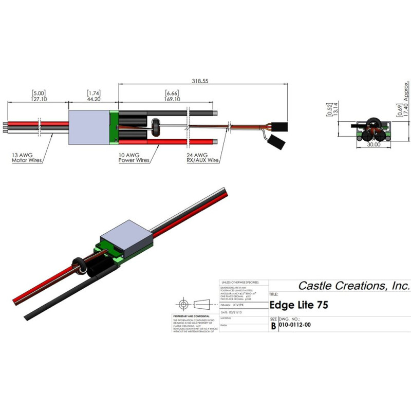 *RC HOBBY APPLICATION RATING: 75 A with proper cooling. Phoenix Edge Lite controllers are designed without a heatsink for extreme airflow applications, such as EDF aircraft, or for applications where average current requirements are much lower than peak current requirements. The temperature of the controller must never exceed 212°F (100°C). Exceeding current or temperature ratings can damage components and shorten the life of the ESC. Always check system current draw at full throttle. Reduce the load or increase the airflow to lower the operating temperature of the ESC.