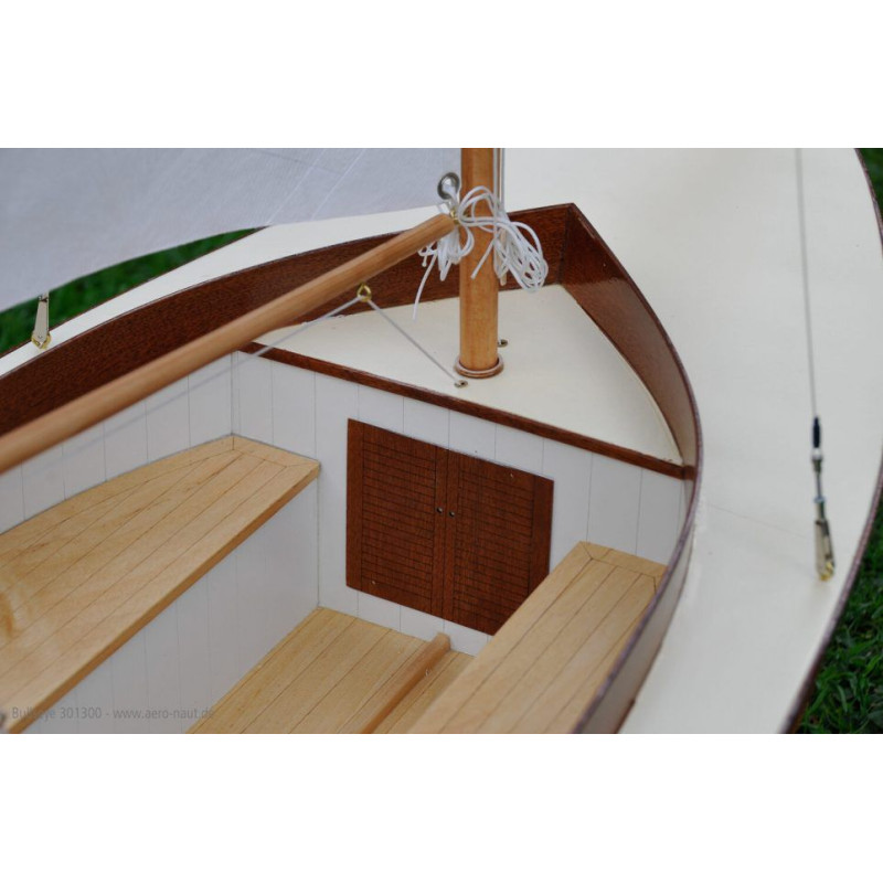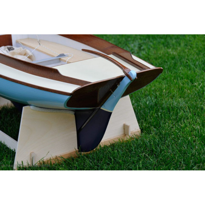 What makes the Bullseye better than its ancestor is the wider side deck and enclosed seating benches. This means that when sailing, water won't seep into the cockpit, and there will be less room in the cockpit if it overflows. The result is safe sailing. The model retains the good sailing characteristics of the original. It floats like the big ones, but also wants to be actively steered. To let down, the sails must be opened, and the tack requires tight sails. Gusts must be weeped out by lowering the sheets or sharpening them slightly. This ensures fun sailing and long-term enjoyment of the model, which can be sailed safely up to three Beaufort units. The model also looks lovely and has the potential for your own ideas. There are no transportation problems with the Bullseye either, as it fits in the trunk of a small car, and can be rigged and ready to sail on the lake in less than three minutes.