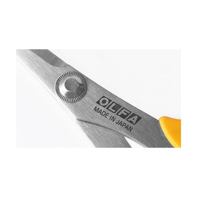 Scissors OLFA SCS-4 have a total length of 13 cm, large, comfortable handles that fit 3 fingers. This ensures greater cutting precision and less hand fatigue during long-term cutting. The blades fit snugly and even a thin cloth is not pulled between the blades. The tip of the scissors is sharp and allows you to precisely trim small parts. The scissors also have a spring washer to ensure that the blades stick to each other well. The screw connecting the blades is moved closer to the tip of the scissors, which makes it possible to cut with less force. The blades are made of stainless steel.