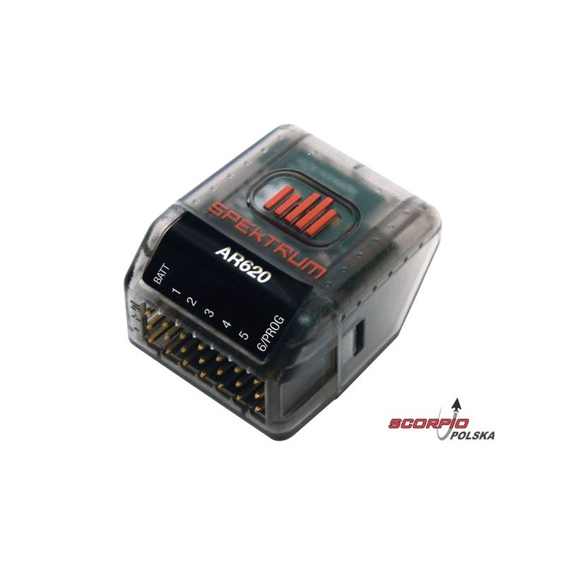 New 6-channel miniature RC receiverSpektrumAR620 with DSMX / DSM2 modulation in the 2.4 GHz band with full range. Completely new design, mainly a new integrated antenna in the housing and integrated telemetry. No more damaged antennas! You can easily pair with the transmitter with a large button, no pairing connector is needed. Weight only 8 g.