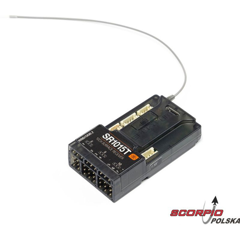 Spektrum SR1015T RC receiver with 10 channels and DSMR+/DSMR modulation for RC cars and boats. the 10 fully proportional channels provide greater flexibility and control versatility for auxiliary systems such as winches, lights, etc. Features excellent range and response, especially in areas where multiple systems operate in the 2.4 GHz band. Features full telemetry coverage. Supports Spektrum Smart technology via SRXL2 protocol - communicates with Spektrum Smart FIRMA electronic controllers and transmits telemetry without sensors. It includes ports for connecting telemetry sensors - VOLT to measure voltage, RPM to measure RPM, TEMP to measure temperature, as well as an XBUS input and Micro USB connector. For easy pairing, there is a pairing button on the top side.