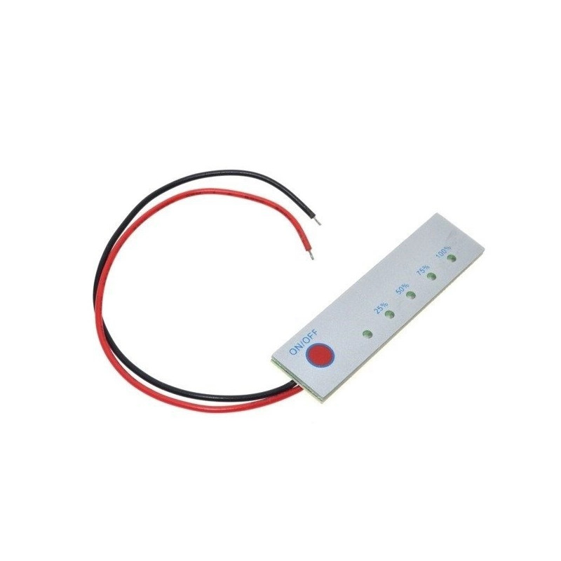 4s 14.4V lithium battery meter with LED scale in panel version. A simple meter for use in many projects. The status of the battery is displayed through the LED scale. Each LED, has an assigned percentage charge level. The tester indicates the charge level when the ON/OFF button is pressed.