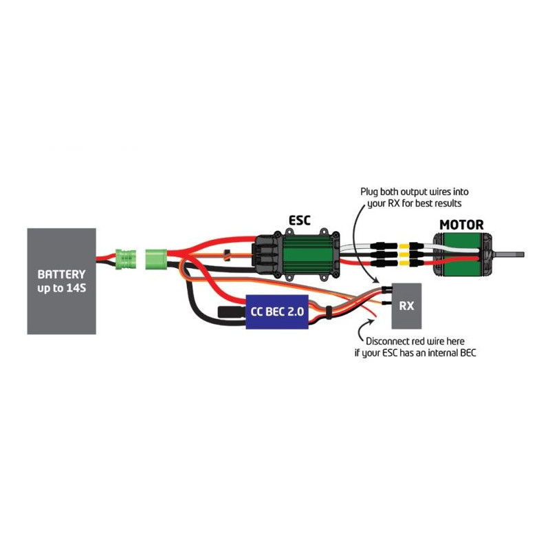 - CC BEC 2.0 should never be used in series or in parallel with another BEC or spare receiver package connected to the RX/server circuit.