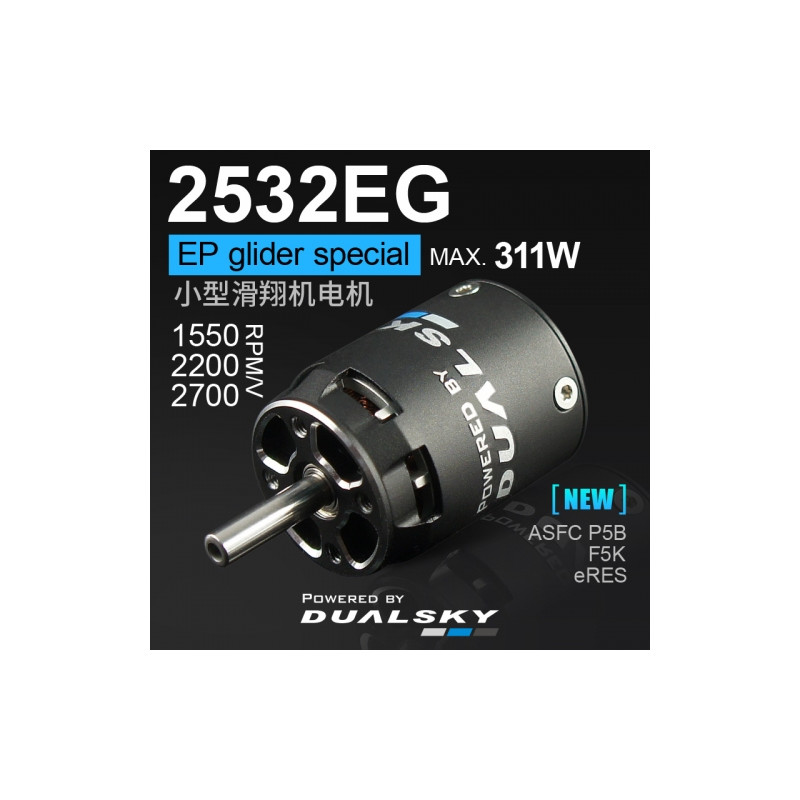 XM2532EG to linia 14-polowych silników elektrycznych marki Dualsky o średnicy 25mm, przeznaczona do małych modeli szybowców o wąskich kadłubach np. F5J, z dziobem obciętym pod kołpak 25-32mm. Mocno ażurowany front silnika i wirnik z wentylatorem przy wykorzystaniu kołpaka „turbo” zapewniają wyśmienite chłodzenie. Brak wirującego rotora oraz kable wyprowadzone z tyłu silnika pozwalają na łatwe i bezpieczne zamontowanie w ciasnym kadłubie bez ryzyka przetarcia przewodów. Silnik posiada wał o średnicy 4 mm, pusty w środku (hollow shaft). W silniku zastosowano wytrzymałe, wysokoobrotowe łożyska NMB.