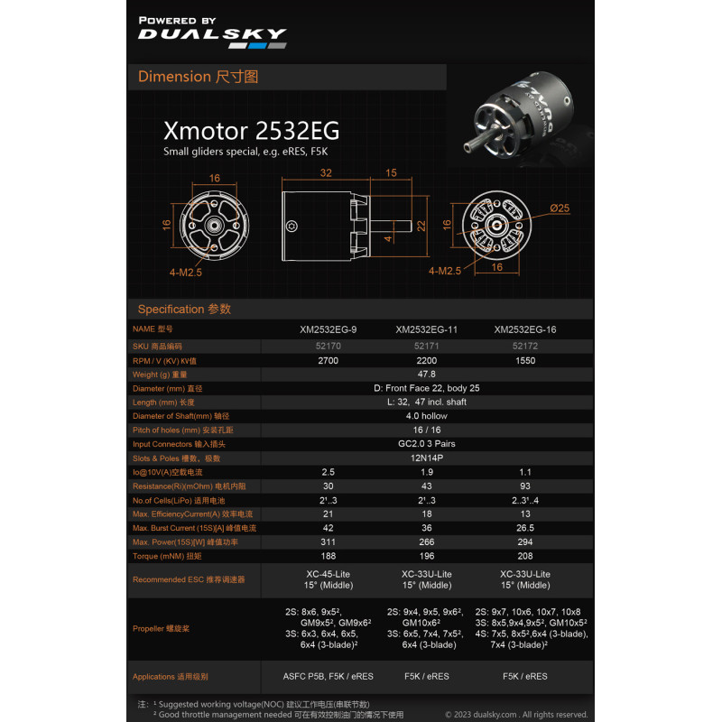 XM2532EG to linia 14-polowych silników elektrycznych marki Dualsky o średnicy 25mm, przeznaczona do małych modeli szybowców o wąskich kadłubach np. F5J, z dziobem obciętym pod kołpak 25-32mm. Mocno ażurowany front silnika i wirnik z wentylatorem przy wykorzystaniu kołpaka „turbo” zapewniają wyśmienite chłodzenie. Brak wirującego rotora oraz kable wyprowadzone z tyłu silnika pozwalają na łatwe i bezpieczne zamontowanie w ciasnym kadłubie bez ryzyka przetarcia przewodów. Silnik posiada wał o średnicy 4 mm, pusty w środku (hollow shaft). W silniku zastosowano wytrzymałe, wysokoobrotowe łożyska NMB.