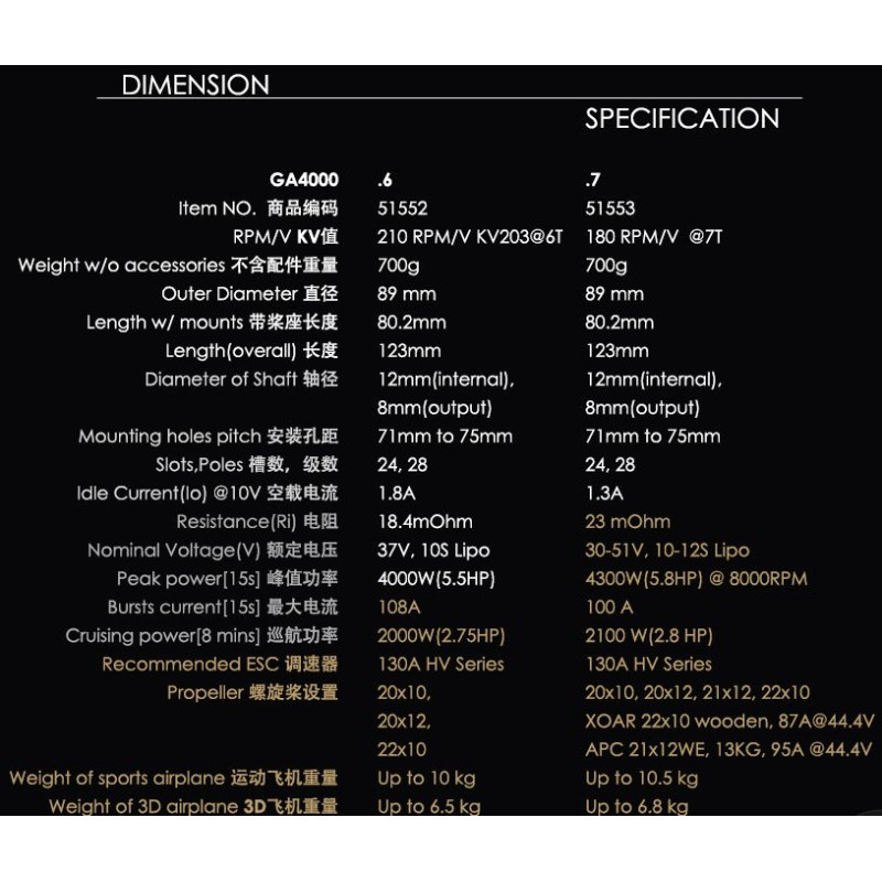Topowa linia silników elektrycznych marki Dualsky przeznaczona do dużych modeli. GA4000.6 przeznaczony jest do modeli o wadze do 10.5kg lub modeli akrobatów 3D o wadze do 6.8kg. Zamiennik silników benzynowych 35-40cm3