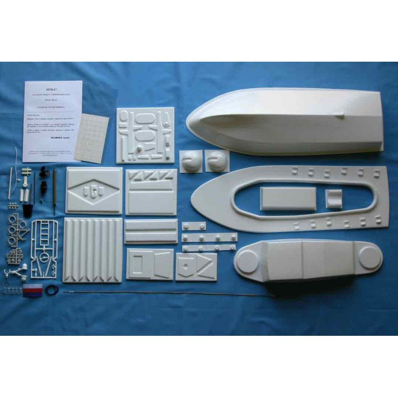 Model kutra torpedowego MTB 67 czeskiej firmy Vladyka, wykonany z tłoczonego tworzywa do samodzielnego złożenia i malowania. W zestawie znajduje się: kadłub, wał, śruba, ster, komplet naklejek oraz drobne elementy imitujące wyposażenie pokładowe.