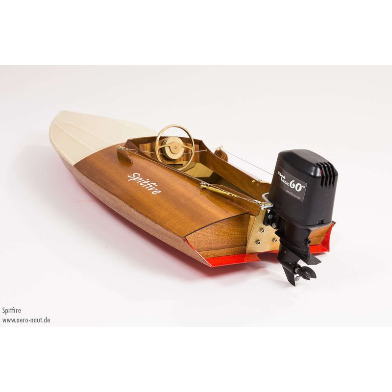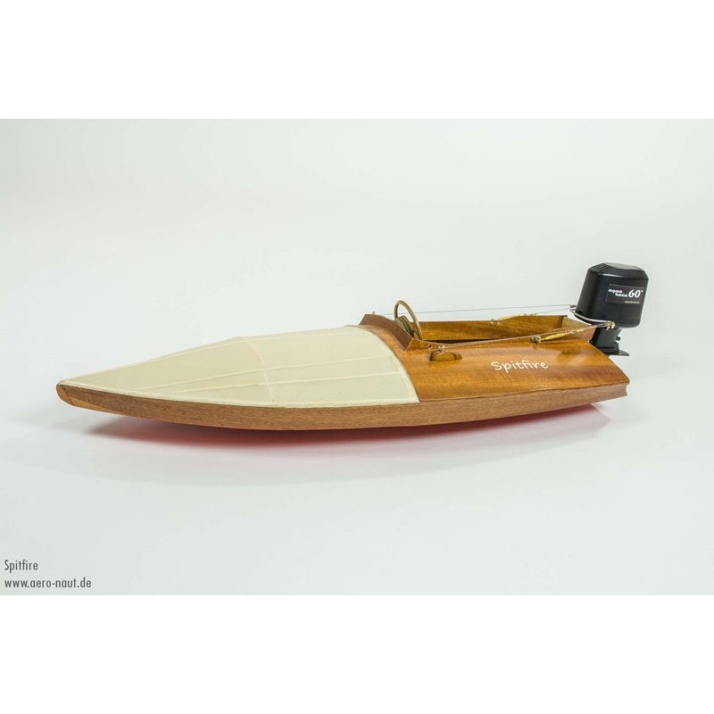 Półmakieta w wersji KIT niemieckiej łodzi motorowej Spitfire z lat 50-tych, wyprodukowana przez firmę Aero-Naut. Kadłub z wręg sklejkowych, poszycie z mahoniu. Zestaw zawiera: wszystkie wycięte elementy potrzebne do złożenia łodzi, obrazkową instrukcję, komplet naklejek oraz drobne elementy takie jak knagi, zaczepy itp... Zestaw nie posiada silnika widocznego na zdjęciach, do zakupienia w naszym sklepie