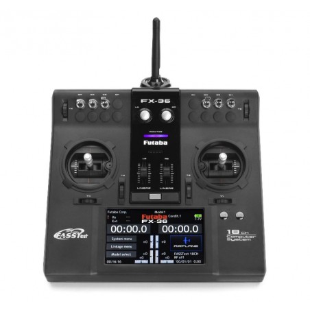 Osiemnastokanałowy zestaw RC Futaba FASSTest (18/12CH) i T-FHSS Air z telemetrią, FASST(Multi/7ch), S-FHSS 2,4GHz z możliwością rozbudowy do 32 kanałów (z 2 modułami multiprop). Dotykowy wyświetlacz LCD HVGA, wyświetlacz telemetrii, precyzyjne crossfadery, 10 przełączników, 4 suwaki i 2 pokrętła, 6 digi trimów. System operacyjny MS Windows Compact 7, 30 modeli + pamięć karty SD, zaawansowane programy dla samolotów akrobacyjnych, szybowców, śmigłowców i multikopterów. Dowolne przypisywanie funkcji, do 8 trybów lotu. Z odbiornikiem R7208SB.