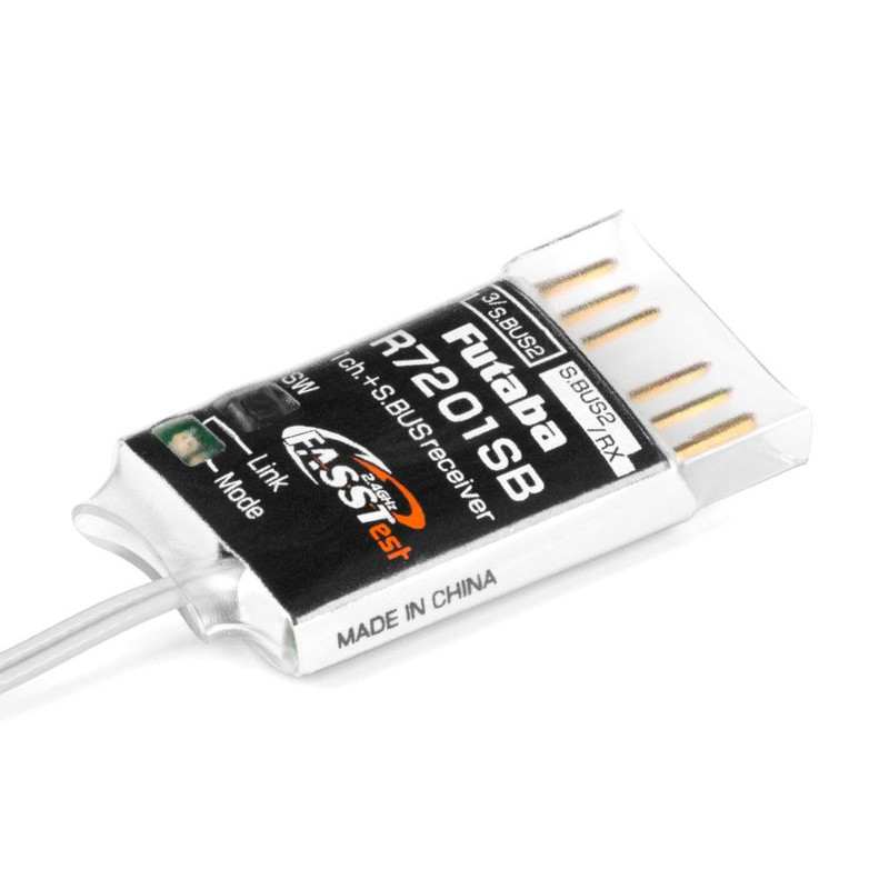 Mały i bardzo lekki odbiornik telemetryczny systemu transmisyjnego Futaba FASSTest 2,4 GHz z parą pełnozakresowych anten różnicowych. Przeznaczony jest przede wszystkim do stosowania w dronach i innych modelach wykorzystujących jednostki sterujące komunikujące się poprzez S.BUS lub S.BUS2.; dzięki swoim kompaktowym wymiarom i bardzo małej masie nadaje się również do małych modeli samolotów z serwami S.BUS/S.BUS2 i doskonale sprawdza się jako odbiornik zapasowy w pracy z dwoma odbiornikami z innymi odbiornikami FASSTest. Opcjonalne tryby kanałów routera R7201SB pozwalają na działanie jednego gniazda jako klasycznego wyjścia kanału PWM (kanał 3)/portu S.BUS2 lub S.BUS; drugie gniazdo pełni funkcję portu S.BUS2 lub służy do podłączenia drugiego odbiornika w pracy dwuodbiornikowej. Port S.BUS2 do dwukierunkowej komunikacji umożliwia podłączenie serwerów S.BUS2, czujników telemetrycznych i innych kompatybilnych urządzeń. Stany pracy odbiornika sygnalizowane są za pomocą diody LED.