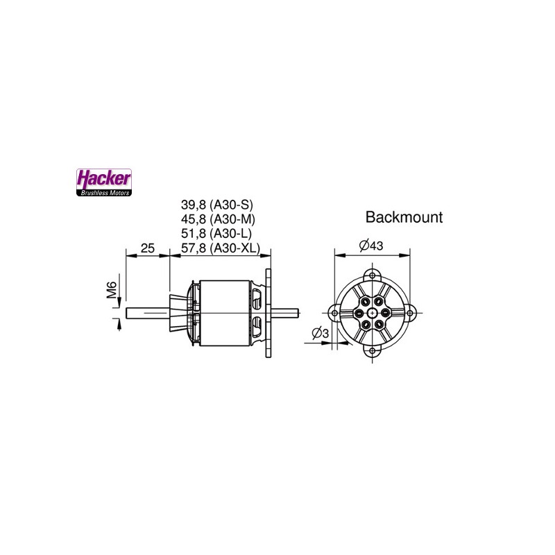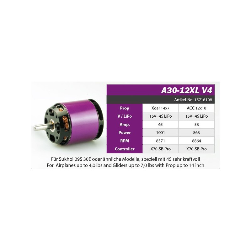 Nowa seria silników bezszczotkowych firmy Hacker A30 z serii V4 oferuje zwiększoną wydajność. Nowo skonstruowana tylna osłona silnika i ulepszony wentylator umożliwiają większą przepustowość mocy, a co za tym idzie ciągła odporność na obciążenie została dodatkowo ulepszona. Silnik dedykowany do modeli 3D o masie ok. 1,5 kg.