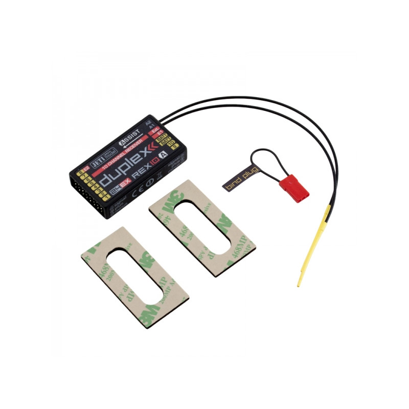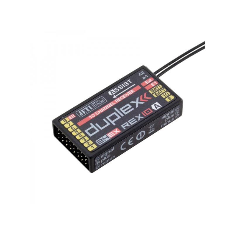 10-kanałowy pełnozasięgowy odbiornik Jeti REX 10A z wbudowanym systemem stabilizacyjnym ASSIST, obsługujący funkcje telemetryczne i kompatybilny z protokołami Jeti EX oraz EX Bus.
