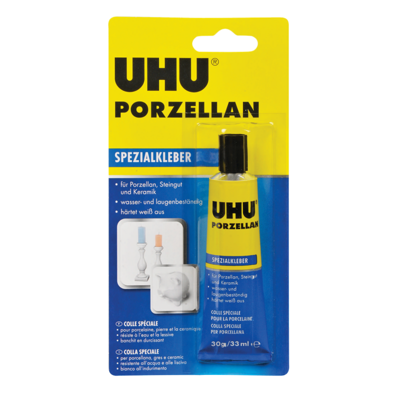 Biały, lepki specjalny klej UHU PORZELLAN jest idealny do do klejenia, uszczelniania i naprawy porcelany, marmuru, kamienia, ceramiki. Jest odporny na gorącą wodę, konwencjonalne domowe środki czyszczące i rozcieńczone zasady.