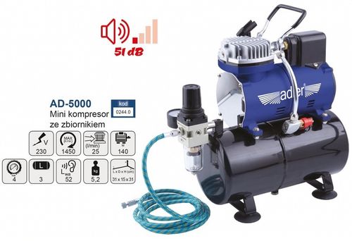 Model AD-5000 wyposażony jest w 3 litrowy zbiornik powietrza, umożliwiający pracę z mini kompresorem na zupełnie innym poziomie.
