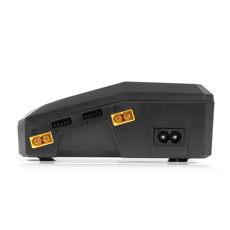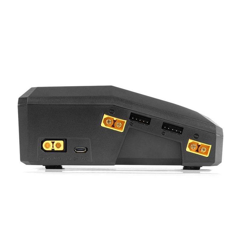 Ładowarka wyposażona jest w gniazda wyjściowe XT60 we wszystkich kanałach oraz uniwersalne gniazda na złącza serwisowe JST-XH umożliwiające bezpośrednie podłączenie przewodów zasilających akumulator oraz złącza serwisowe JST-XH zestawów 2-4S - w przypadku stosowania zestawów ze złączami XT60 i JST-XH można obejść się bez kabli i adapterów do ładowania.