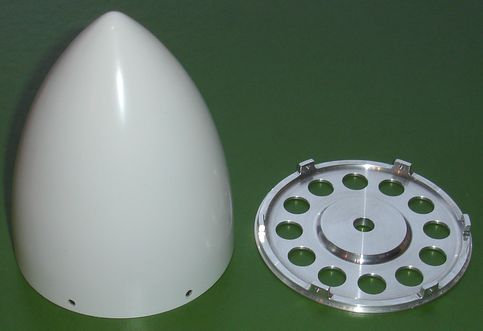 Kołpak laminatowy z ażurowaną podstawą aluminiową czeskiej produkcji. Podstawa montowana jest na wał silnika, a kołpak przykręcany po obwodzie za pomocą wkrętów ampułowych M3.