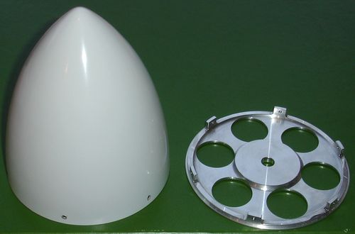 Kołpak laminatowy z ażurowaną podstawą aluminiową czeskiej produkcji. Podstawa montowana jest na wał silnika, a kołpak przykręcany po obwodzie za pomocą wkrętów ampułowych M3.