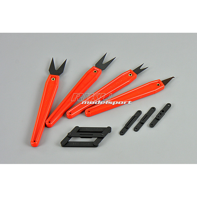 Zestaw wysokiej jakości 3 noży (o szerokości: 20, 16, 10 mm) do wycinania otworów pod zawiasy, 1 nożyka wydłubującego resztki drewna ze szczeliny oraz prowadnicy ułatwiającej wycięcie (wycentrowanie). Produkt znanego amerykańskiego producenta akcesoriów modelarskich DU-BRO.