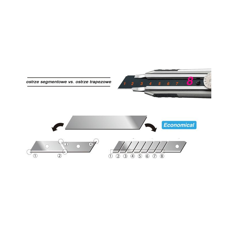 Ostrza OLFA są niezwykle ostre. Podczas cięcia i wymiany ostrza zachowaj szczególną ostrożność. Zużyte ostrza mogą być również niebezpieczne - przed wyrzuceniem zabezpiecz je wykorzystując np. pojemniki, w których dostarczane są nowe ostrza lub też skorzystaj ze specjalnych pojemników DC-2 i DC-4.