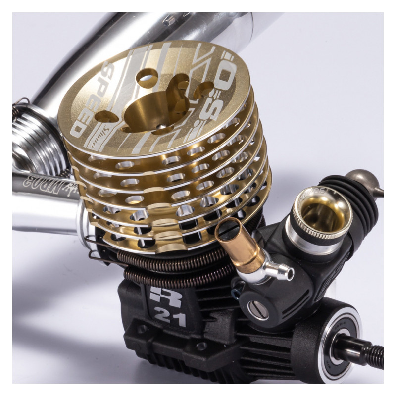 Opracowaliśmy edycję OSSPEED R21 Shimo we współpracy z Takaaki Shimo, wielokrotnym zdobywcą podium Mistrzostw Świata IFMAR 1/8 Racing. Jest to silnik 7-portowy z nową tuleją cylindrową, która ma dodatkowe otwory zapobiegające przegrzaniu. Głowica chłodząca i ogranicznik gaźnika 8,5 mm są anodowane na specjalny kolor; szampańskie złoto. Wał korbowy jest modyfikowany tak, aby spełniał jego preferencje, płynne przenoszenie mocy od prędkości dolnej do maksymalnej. Po raz pierwszy robimy kombinację tłumika TR02 (EFRA2165) z kolektorem MR03-WC na potrzeby tej edycji specjalnej.
