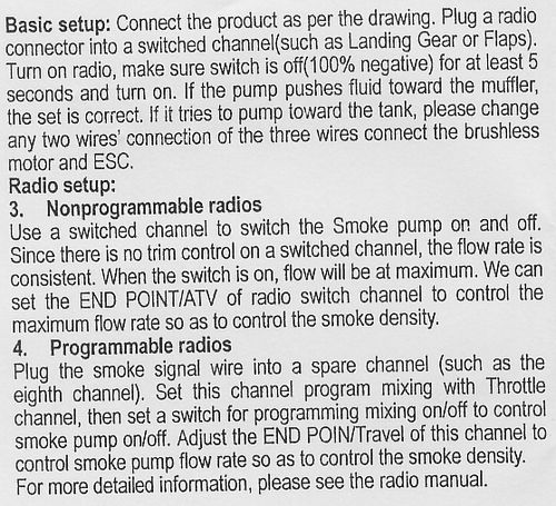 Zasilanie 7,2V (6 ogniw NiMH) lub 7,4V (2 ogniwa Li-pol) lub 6,6V (2 ogniwa LiFe). Przewody pompki i regulatora zakończone są złączkami gold 3,5mm, co zapewania szybkie podłączenie. Od strony zasilania regulator posiada gniazdo JST. Obudowa pompki posiada 3 otwory montażowe (wkręty znajdują sie komplecie).