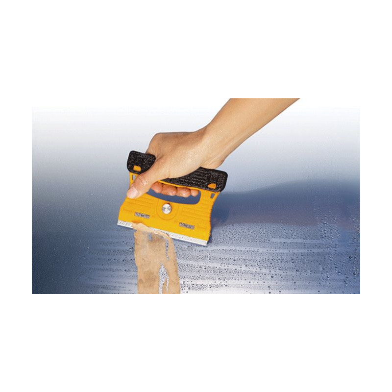 Uchwyt oraz osłona nierdzewnego ostrza o szerokości 120mm wykonane z żywicy polipropylenowej wzmocnionej włóknem szklanym zapewniają zwiększoną wytrzymałość i odporność na aceton. Razem z płytką ze stali nierdzewnej mocującą ostrze tworzą uchwyt o grubości 7mm /ze śrubą mocującą - 14mm/. Rowkowanie na żółtej powierzchni uchwytu i czarnej osłonie ostrza pomagają znaleźć pewny i wygodny sposób trzymania narzędzia. Skrobak jest bardzo lekki, waży tylko 115 gramów.