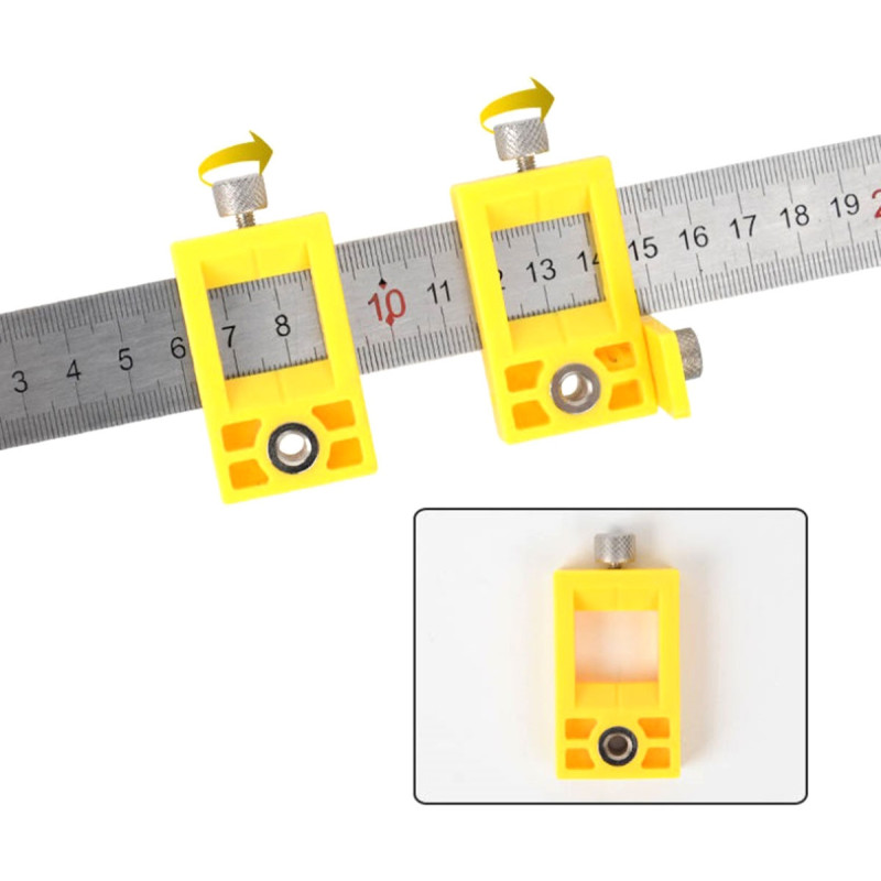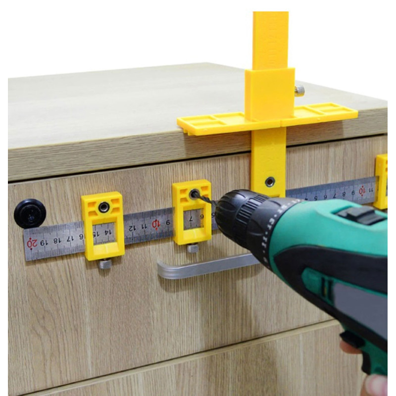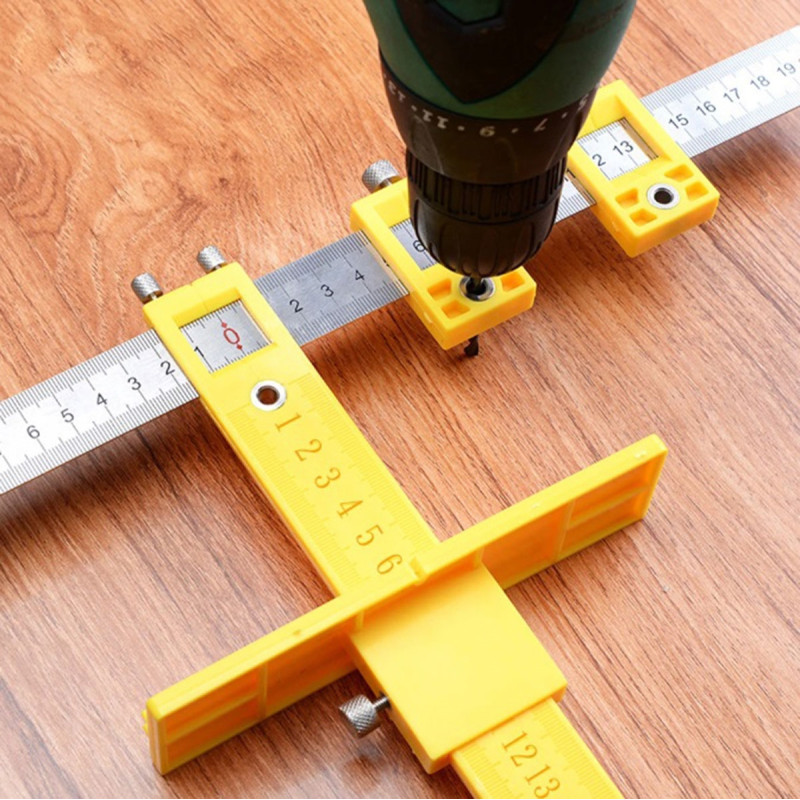 Narzędzie do centrowania otworów. Niezwykle praktyczny szablon do wiercenia otworów. Posiada dwie ruchome miarki (poziomą i pionową) z podziałką centymetrową oraz otwory do wiercenia o średnicy 5 mm. Wzornik umożliwia trasowanie na różnych materiałach (drewno, metale, tworzywa sztuczne) i dokładne oznaczenie punktów do nawiercenia. Specjalne śruby zaciskowe ułatwiają utrwalenie ustawienia i stabilne utrzymanie narzędzia na swoim miejscu podczas wiercenia.