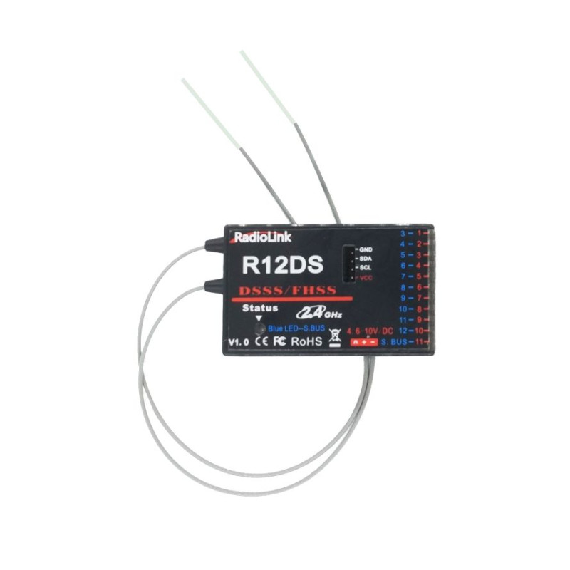 Radiolink R12DS 2,4 GHz to 12-kanałowy synchroniczny odbiornik telemetryczny DSSS i FHSS z przeskokiem częstotliwości, kompatybilny z nadajnikami Radiolink AT9, AT 9S, AT10 i AT10II (nadajniki AT9, AT 9S i AT10 można zaktualizować do 12 kanałów, aktualizując ich oprogramowanie układowe, co można pobrać ze strony producenta http://radiolink.com.cn/doce/at10upgraded.html, AT10II jest już 12-kanałowy w wersji podstawowej). Odbiornik współpracuje z modułami telemetrycznymi PRM-01 i PRM-02.