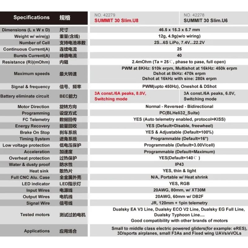 Najwyższej klasy, ultramały regulator obrotów 25A ze zintegrowanym mocnym BEC-em 3A (chwilowo 6A) z napięciem wyjściowym 6V. Dedykowany do mniejszych modeli samolotów sportowych/3D/F3A a szczególnie szybowców z wąskim kadłubem (np. eRES). Dla maksymalnej redukcji wagi regulator opakowany jest jedynie w koszulkę termokurczliwą.