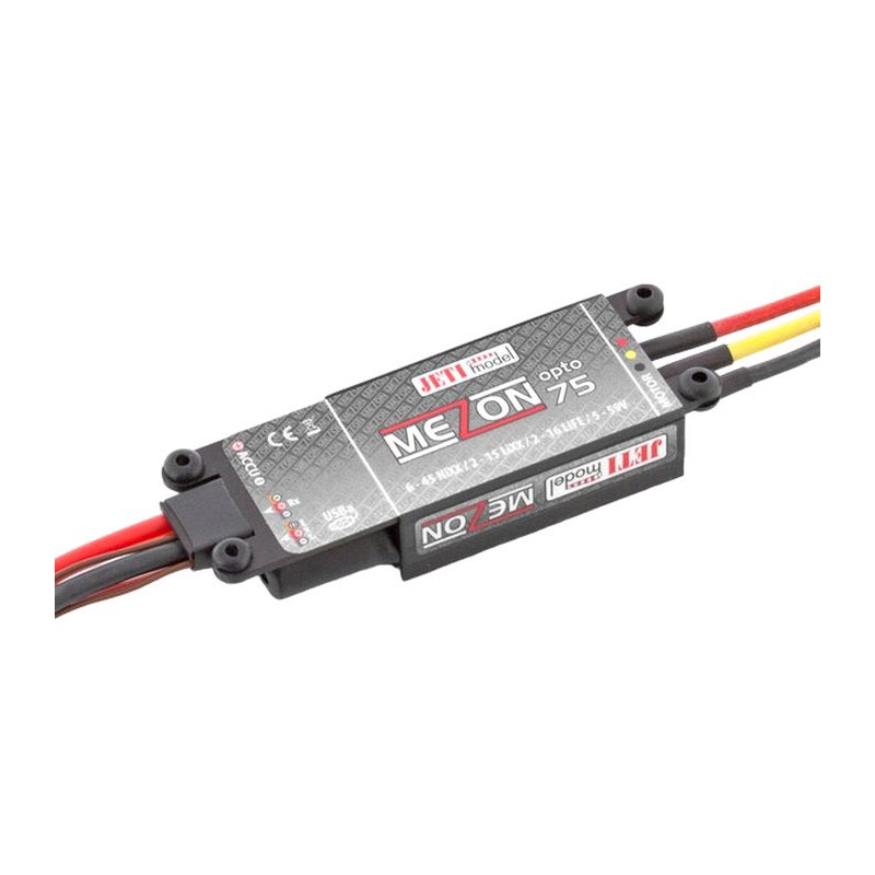 Kontrolery ze zintegrowanymi obwodami BEC zapewniają potężny kontroler napięcia, który może napędzać serwomechanizmy bezpośrednio z akumulatora, eliminując potrzebę stosowania drugiego akumulatora pokładowego. Firmware we wszystkich kontrolerach MEZON może być łatwo aktualizowany przez modelarza. Oznacza to, że za pomocą komputera i adaptera USB wystarczy kilka kliknięć, aby skorzystać ze wszystkich najnowszych aktualizacji i fajnych, nowych funkcji. Wszystkie sterowniki MEZON możesz łatwo skonfigurować za pomocą uniwersalnego narzędzia do programowania JETIBOX.