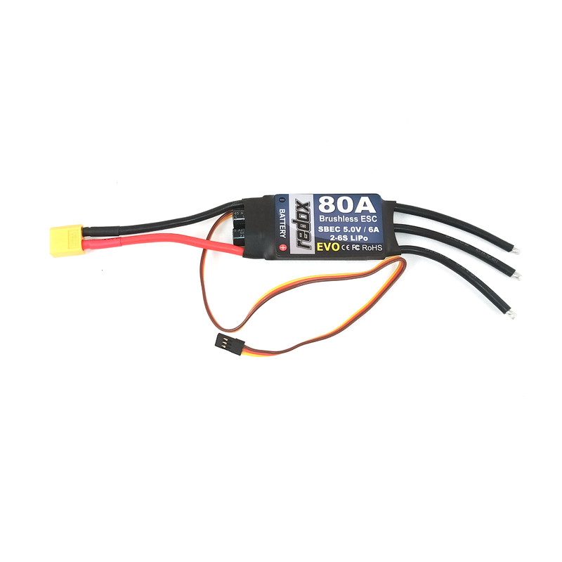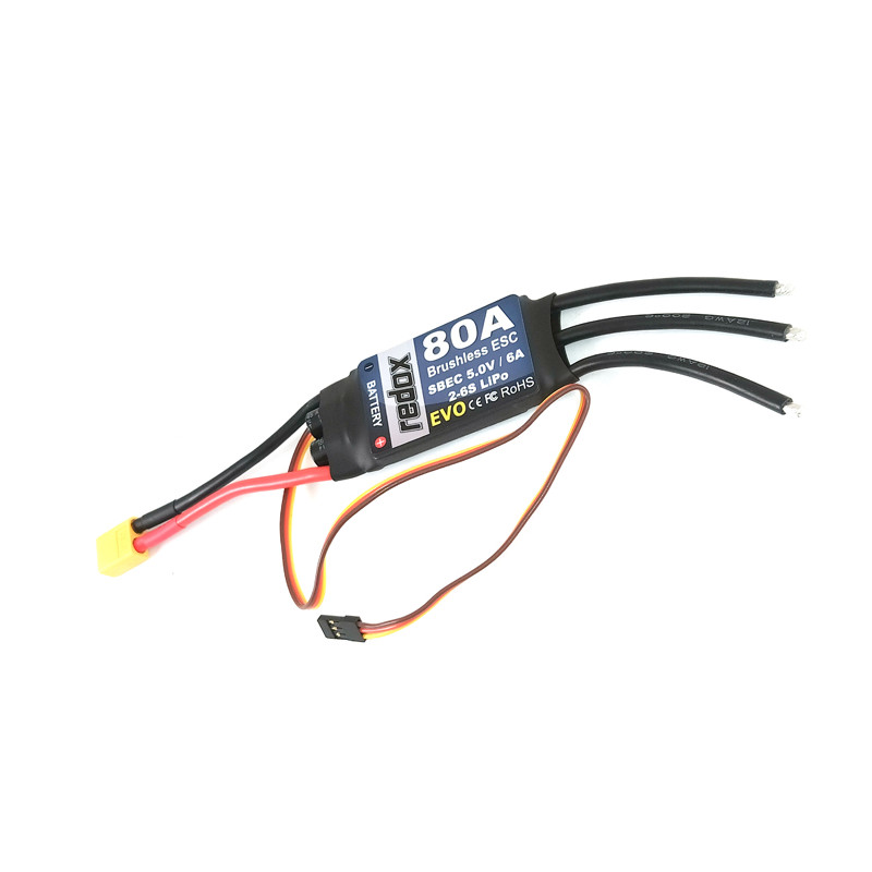 Uniwersalny regulator Redox EVO 80A do silników bezszczotkowych przeznaczony do użytku w modelach samolotów i helikopterów.