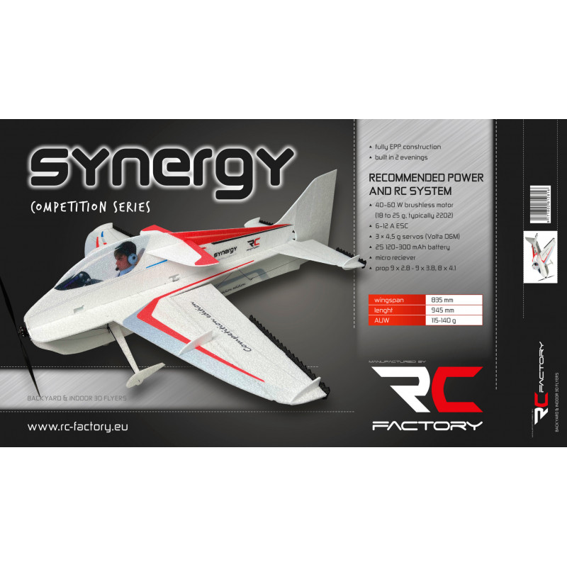 Synergy został zaprojektowany przez pilota zespołu Jana Votava, który chciał wykorzystać całe swoje doświadczenie z kategorii F3A i umieścić je w tym modelu. Synergy jest przeznaczony dla wszystkich pilotów lubiących precyzyjne latanie, precyzyjnie wykonane przewroty, a także wymagające manewry, dzięki czemu ten model może być samolotem wyczynowym dla klasy F3P. Węższe skrzydła i mniejszy obszar na końcu są równoważone przez większe "turbulatory". Model ma bardzo przewidywalną i liniową reakcję we wszystkich pozycjach lotu. Dzięki możliwości powolnego i spokojnego latania, jest idealnym pierwszym modelem na halę, nawet jeśli nie odważysz się jeszcze na akrobacje.