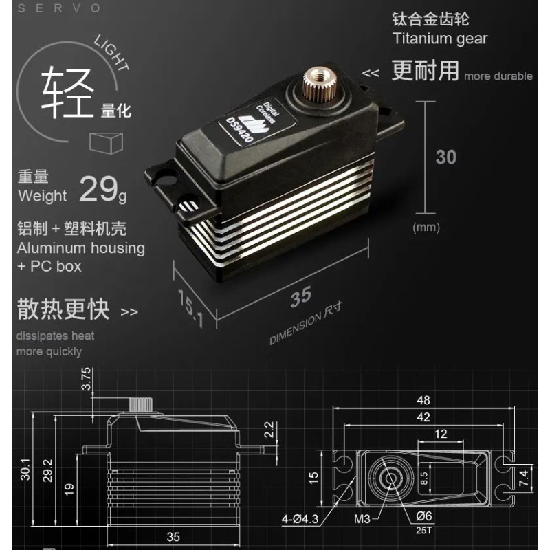 Bardzo precyzyjne cyfrowe serwo wielkości MIDDLE z tytanowymi zębatkami, podwójnie łożyskowane, przygotowane pod zasilanie HV. Frezowana, aluminiowa część obudowy poprawia odprowadzanie ciepła.