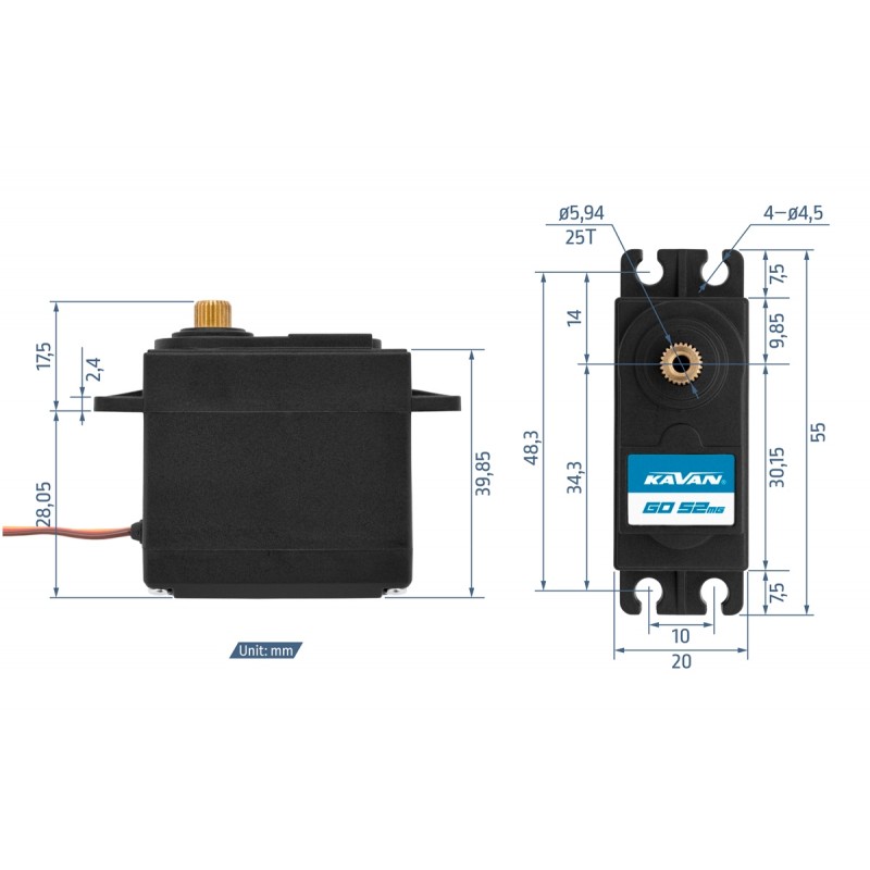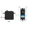 Standardowe serwo firmy Kavan ze stalowymi zębatkami z wałem wyjściowym osadzonym na dwóch łożyskach kulkowych do zastosowania w modelach RC. Obudowa plastikowa. Serwo nie jest programowalne.