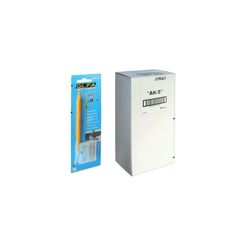 Nóż AK-5 japońskiej firmy Olfa do precyzyjnego cięcia papieru, foli, kartonu - modyfikacja skalpela AK-3. Rękojeść przedłużona do 14 cm / 2cm więcej/, zakończenie w formie wygodnej szpatułki przydatnej np. do dociskania lub formowania drobnych elementów. Obsadka noża o przekroju kwadratowym, zabezpieczającym przed stoczeniem się noża ze stołu. Kształt ten pozwala również na pewne połączenie z nowym pojemnikiem na ostrza - i to na dwa sposoby. Pierwszy z nich to wsunięcie obsadki do prowadnicy wzdłuż boku pojemnika, wygodne do wspólnego przechowywania noża z ostrzami zapasowymi. Drugi sposób to wsunięcie obsadki prostopadle do pojemnika, dzięki czemu nabiera on charakteru wygodnego stojaczka.