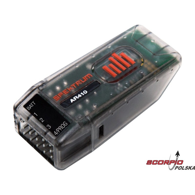 Nowy 4-kanałowy miniaturowy odbiornik RC Spektrum AR410 z modulacją DSMX/DSM2 w paśmie 2,4GHz z pełnym zasięgiem. Całkowicie nowy design a głównie nowa zintegrowana antena w obudowie oraz zintegrowana telemetria. Już nigdy więcej uszkodzonych anten! Dużym przyciskiem łatwo sparujecie z nadajnikiem, nie potrzeba konektora parowania. Masa tylko 7 g.