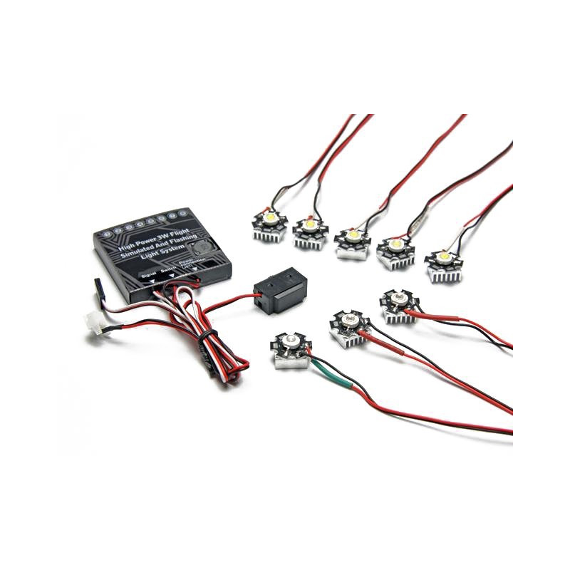 Potężny kompletny zestaw do oświetlenia modeli samolotów lub helikopterów. Do dołączonego kontrolera można podłączyć maksymalnie 8 kolorowych diod LED (świecących, migających). Można zdalnie przełączać do 8 różnych trybów za pomocą kanału przełączającego w nadajniku zdalnego sterowania. Należy stosować oddzielne zasilanie.