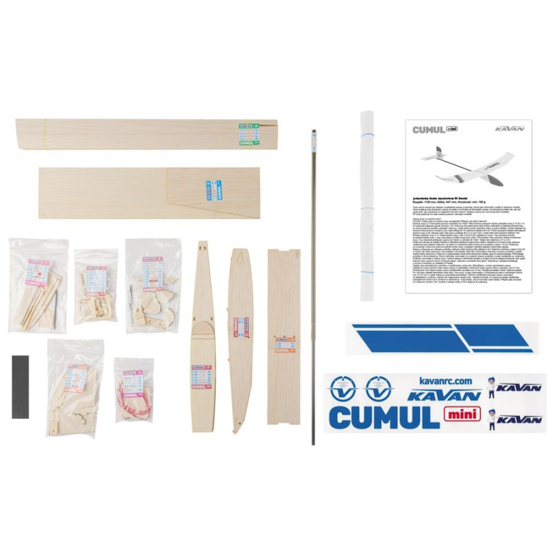 Zestaw zawiera: laserowo wycięty kadłub, części skrzydeł i ogona, węglową belkę ogonową, drobne akcesoria, plan budowy / instrukcję budowy.