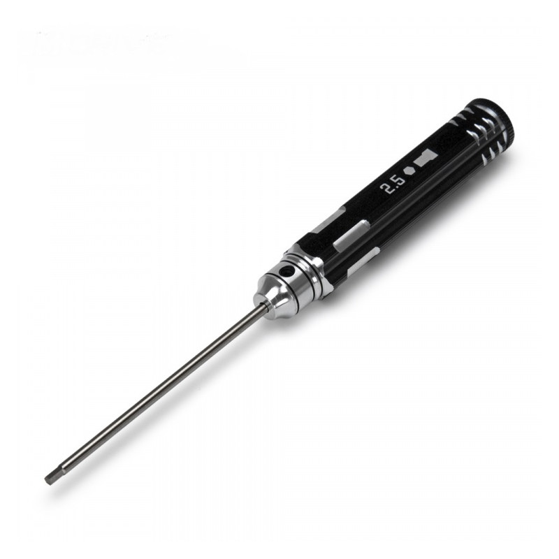 Wkrętak imbusowy z aluminiową radełkowaną rękojeścią anodowaną w kolorze czarnym. Końcówka - część robocza wykonana z wysokiej jakości stali HSS.